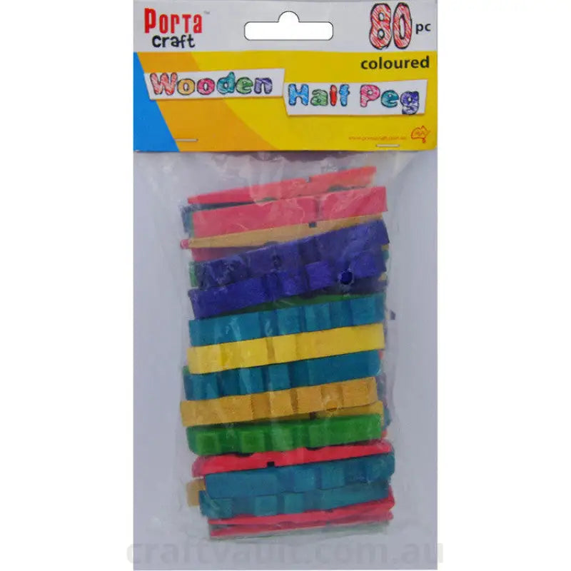 Clothes Pegs Half 80 Pack Coloured (SKU: 067772) is a set of natural wooden dolly pegs with included stands, perfect for building miniature figures, puppets, or crafting imaginative classroom characters. A classic favourite in the craft world, these pegs offer endless creative potential.