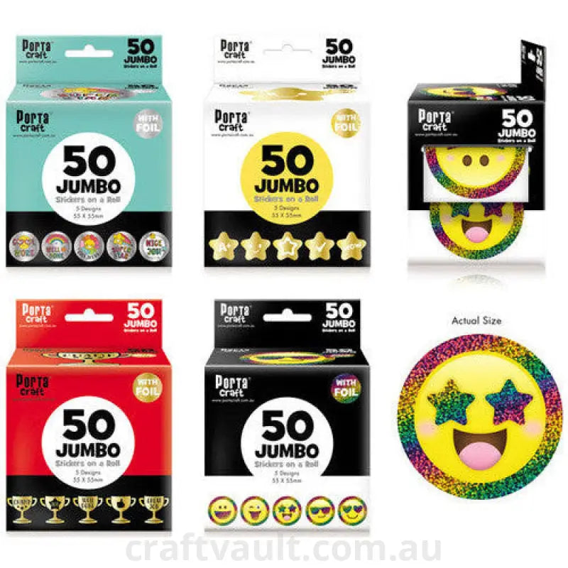 Jumbo Foil Sticker Roll 50 Pack 4 Assorted Designs (SKU: 143933) is a jumbo foil sticker roll pack containing 50 easy-peel stickers in assorted designs. Great for bulk decorating or classroom use.