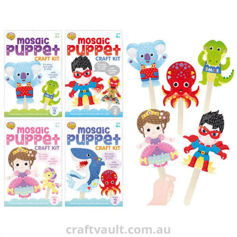 Mosaic Craft Kit Lollipop Puppet 4 Assorted (SKU: 165775) is a colourful and engaging craft kit for kids to create adorable stick puppets with fun mosaic designs. Perfect for creative play, storytelling, and developing fine motor skills.