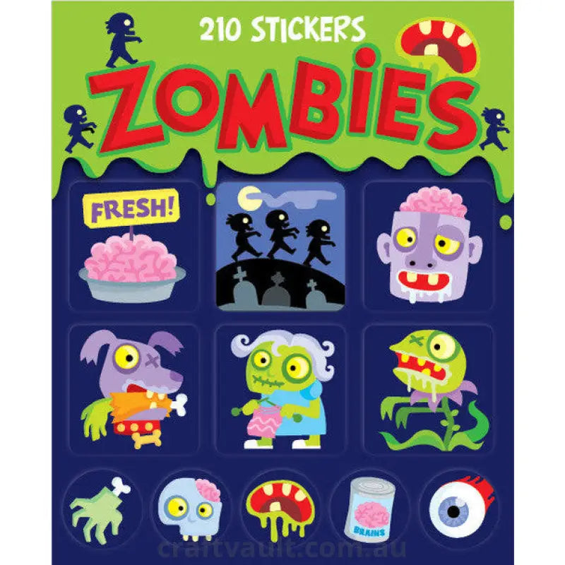 Sticker Books Zombies 210 Stickers (SKU: F01D56) is a fun and reusable sticker book packed with pages of vibrant themed designs, perfect for on-the-go creativity or keeping young hands busy.